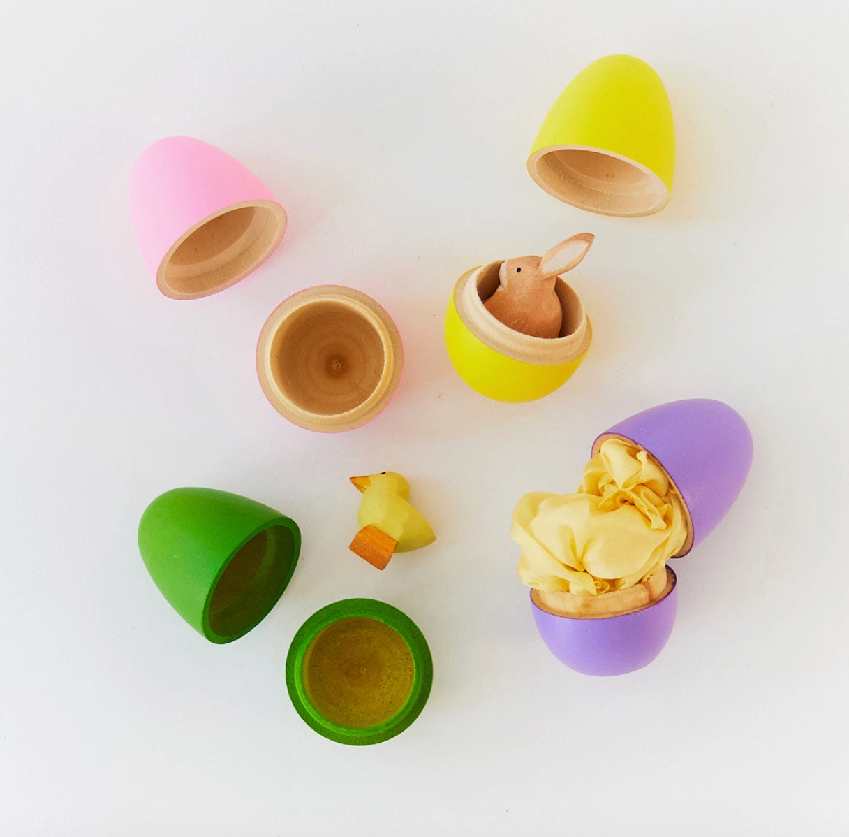 Bring a more thoughtful touch to springtime play with this set of 4 pastel wooden eggs. Made from natural wood and designed for long-lasting use, these eggs are a simple, sustainable alternative to plastic toys.